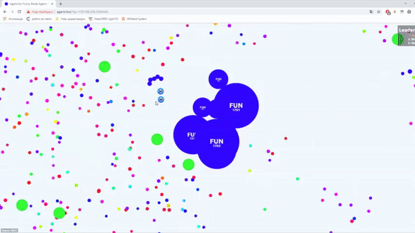 Chase a person (example, you have 4,000 mass and that person has 2,000 mass) and get them close to a virus, then press space twice. The prey will eat your 4th piece then hit the virus due to expanding in diameter, and your third part will eat everything. This does not always work, but if it works you usually get a lot of mass. Sometimes, the player is too small to be popsplitted normally. This will require you to judge whether or not the person is big enough to be popsplitted normally. If they are too small, you would split 3 times, First split away from the target, then popsplit them like you normally would. Another way to popsplit a player if they are too small is to just split 3 times at them. However, this is risky as one of your pieces could eat the virus making the popsplit a fail and leaving you with big problem to deal with.