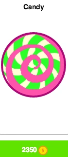 The Candy skin can be purchased in the store for 2350 coins. When equipped, the player's cell will appear as a round, White and green striped and magenta-colored piece of Candy.